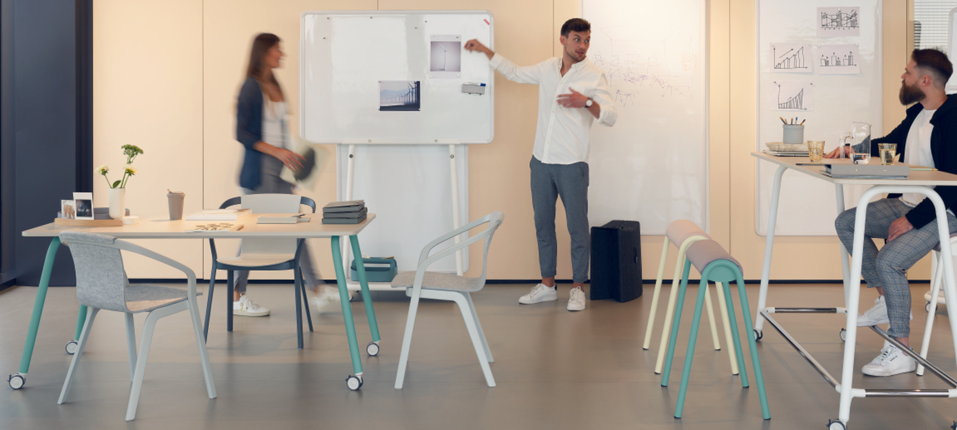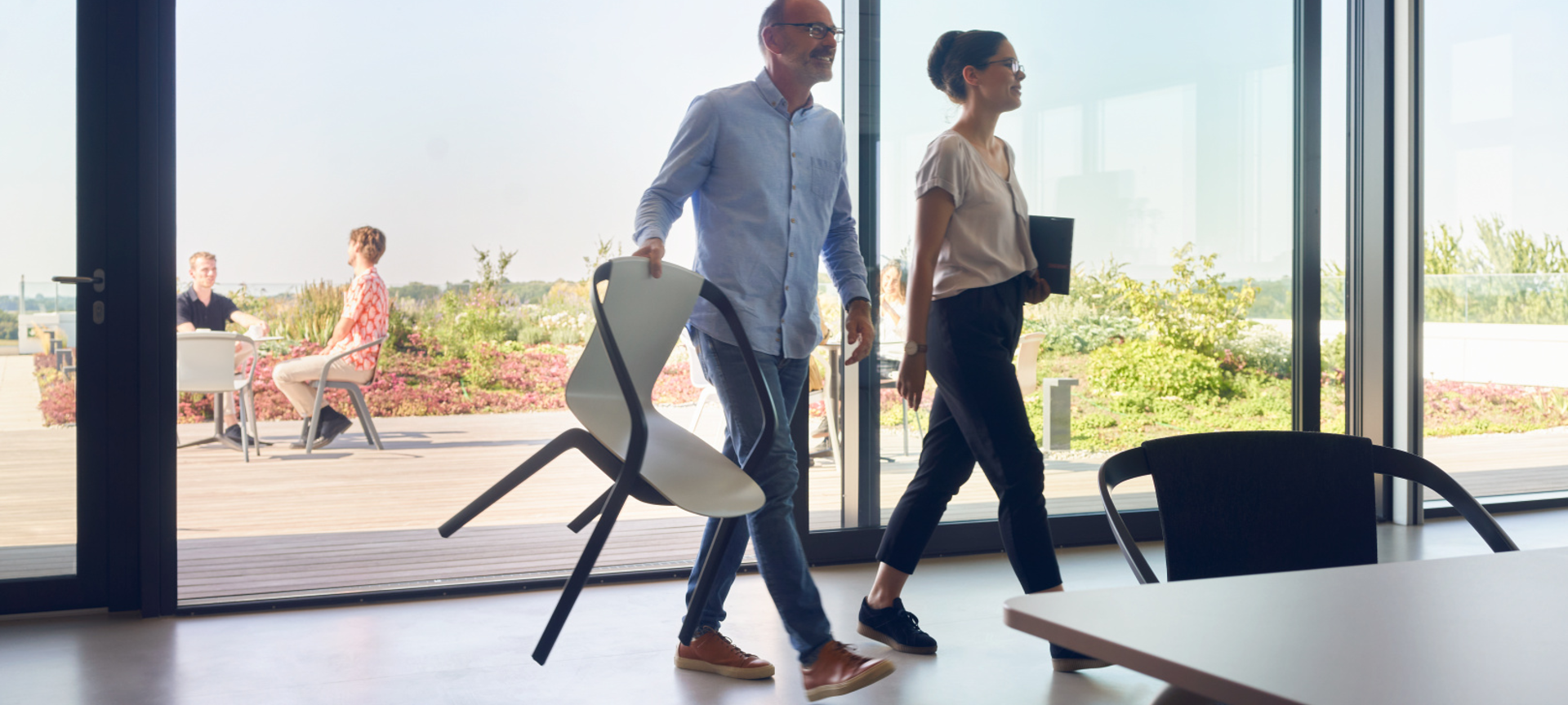 Er begeistert als Besprechungsstuhl, passt in Bibliotheken sowie Co-Working-Bereiche und macht in Cafeterien eine ebenso gute Figur wie in Kantinen. se:mood findet Platz drinnen wie draußen: Er lässt sich ebenso in einem überdachten Terrassenbereich temporär nutzen.