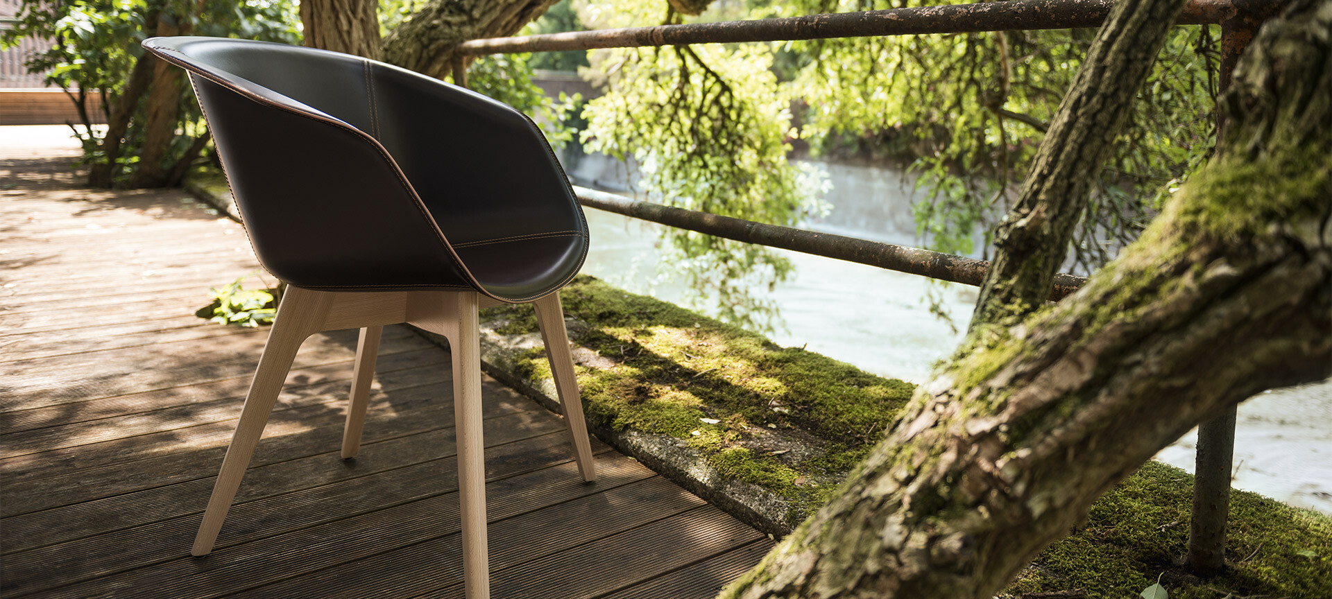 Das wohnliche Design sieht nicht nur gut aus, es tut auch gut. Für spürbare Ergonomie sorgen die den Körper umfließende Schale, die bequemen Armlehnenflügel und die Lordosenvorwölbung.