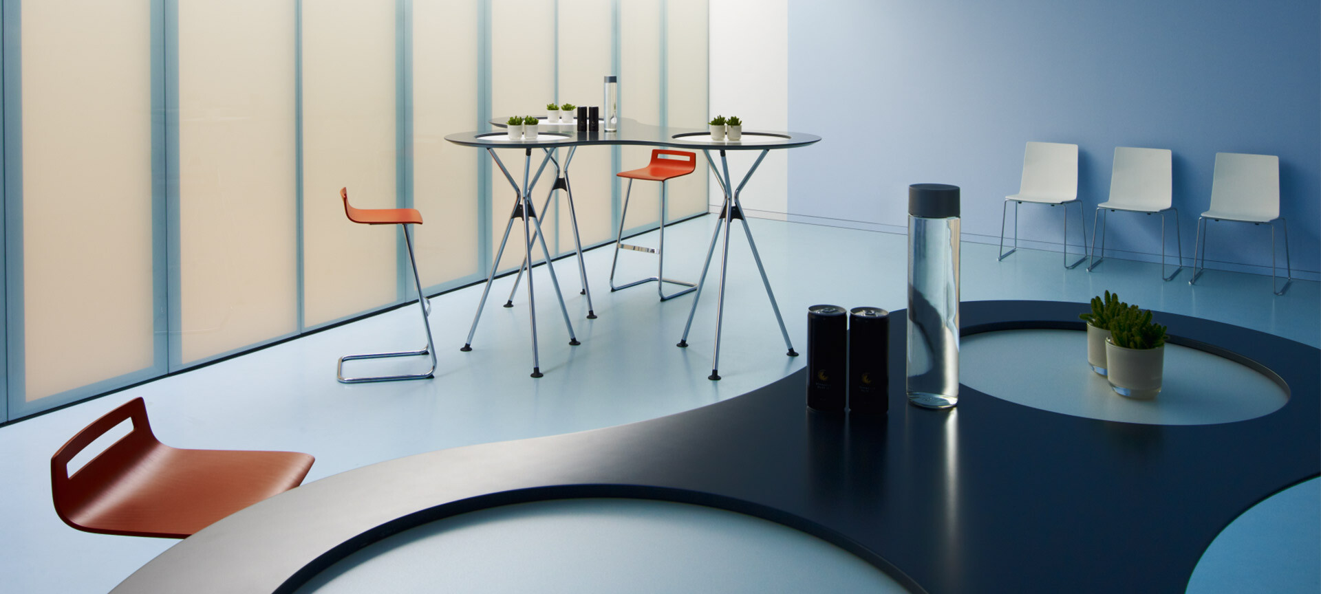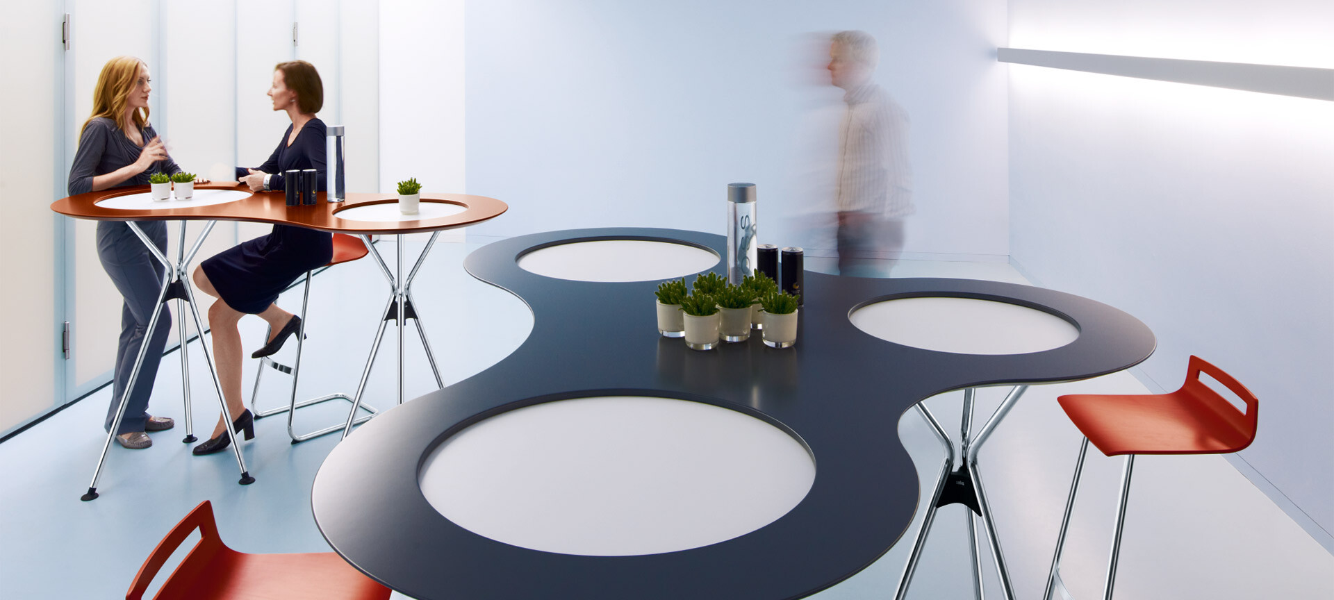 Sedus meet tables wurden entwickelt, um das Zusammentreffen von Menschen angenehm und komfortabel zu machen. Orte der Erholung und Entspannung charakterisieren sie durch grafische Einfachheit und Prägnanz. Mit ausgeprägten Möglichkeiten individueller Gestaltung zeichnen sie einladende Bilder für Bistros, Pausenzonen und Kantinen.