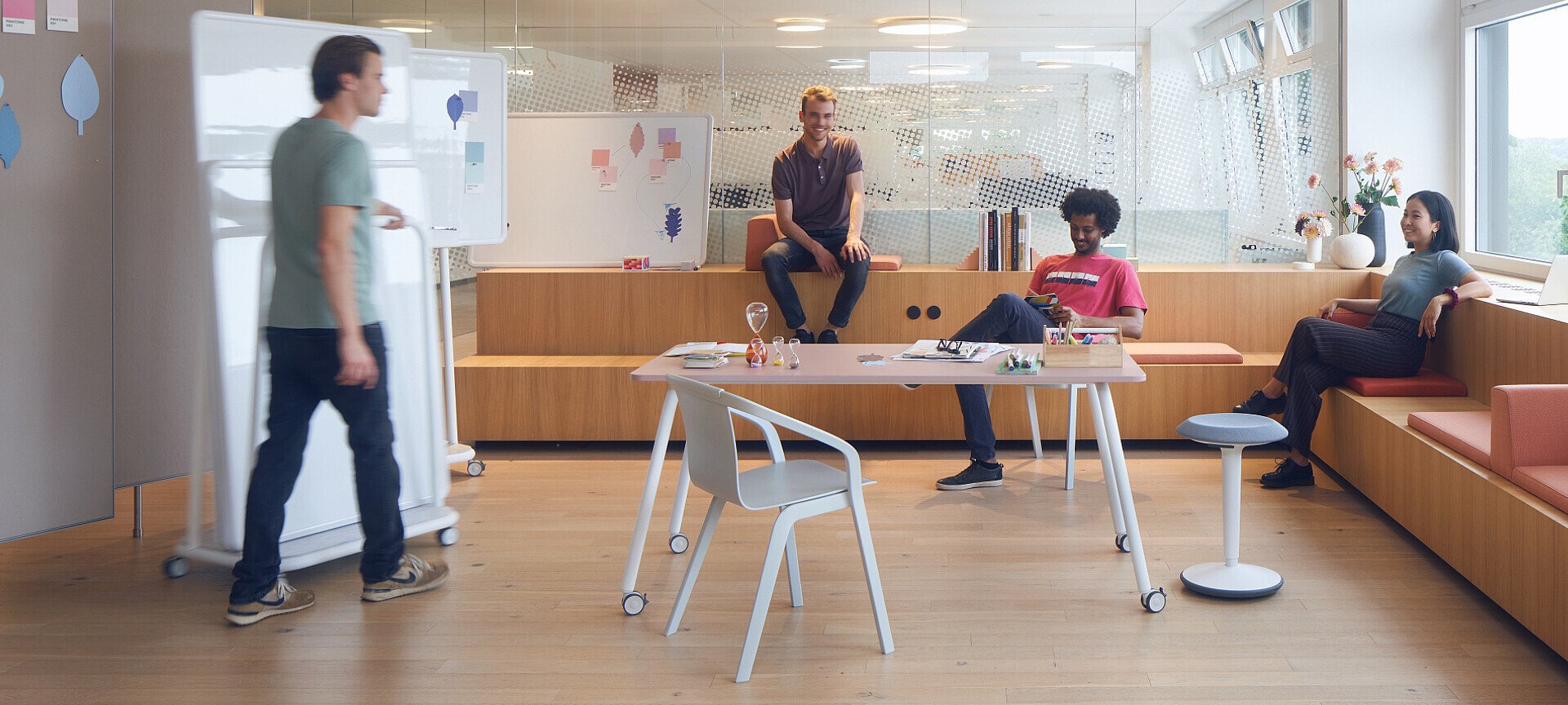 und Workshop-Elemente inklusive Sitzmöbel um interaktiv und gemeinsam arbeiten zu können.